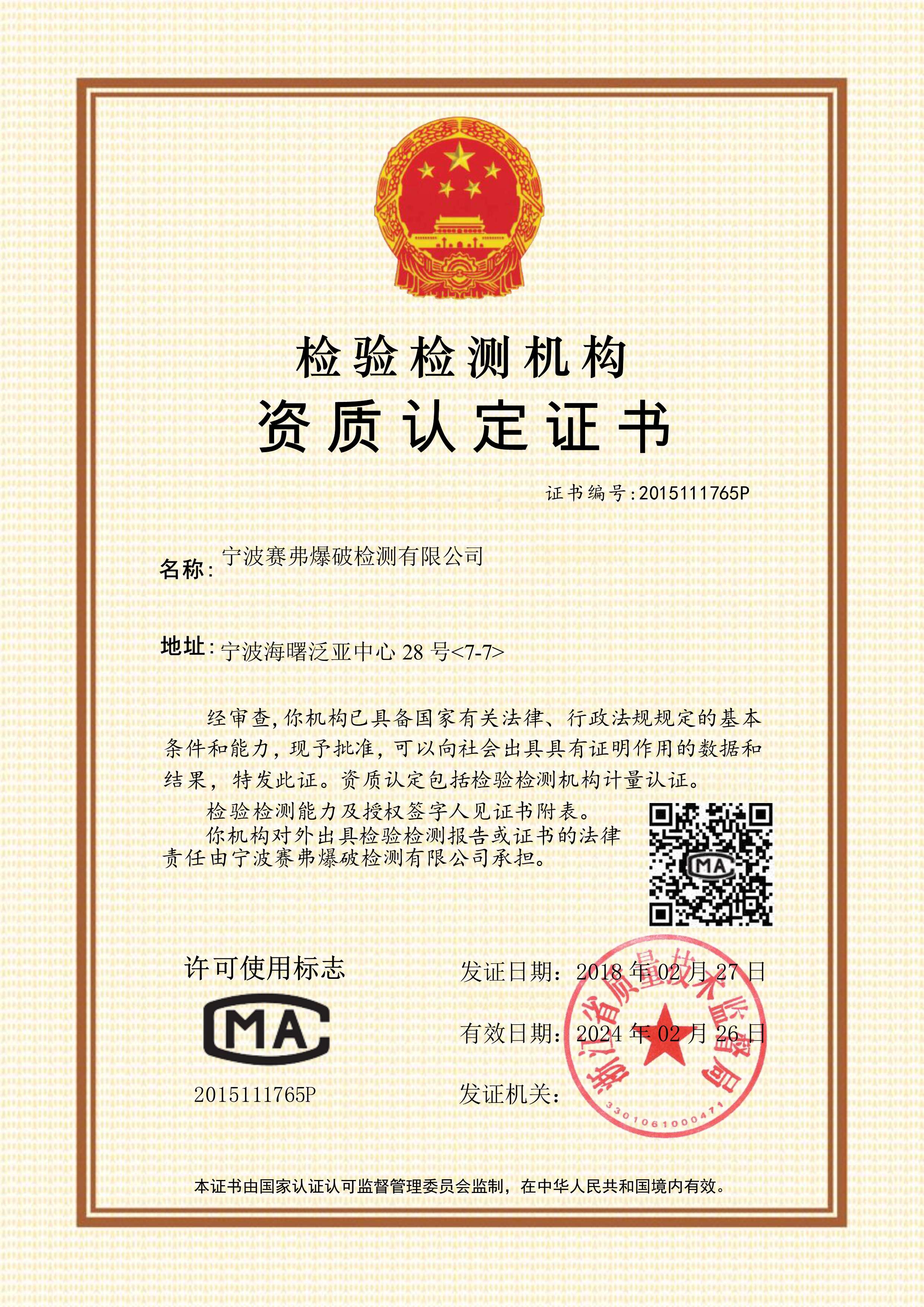 宁波赛弗爆破检测有限公司成立于2013年2月,并于2015年取得国家资质认定计量认证证书(CMA),是国内为数不多的专业的爆破振动检测公司之一,是符合《爆破安全规程》GB6722-2014标准要求的爆破振动第三方检测单位。